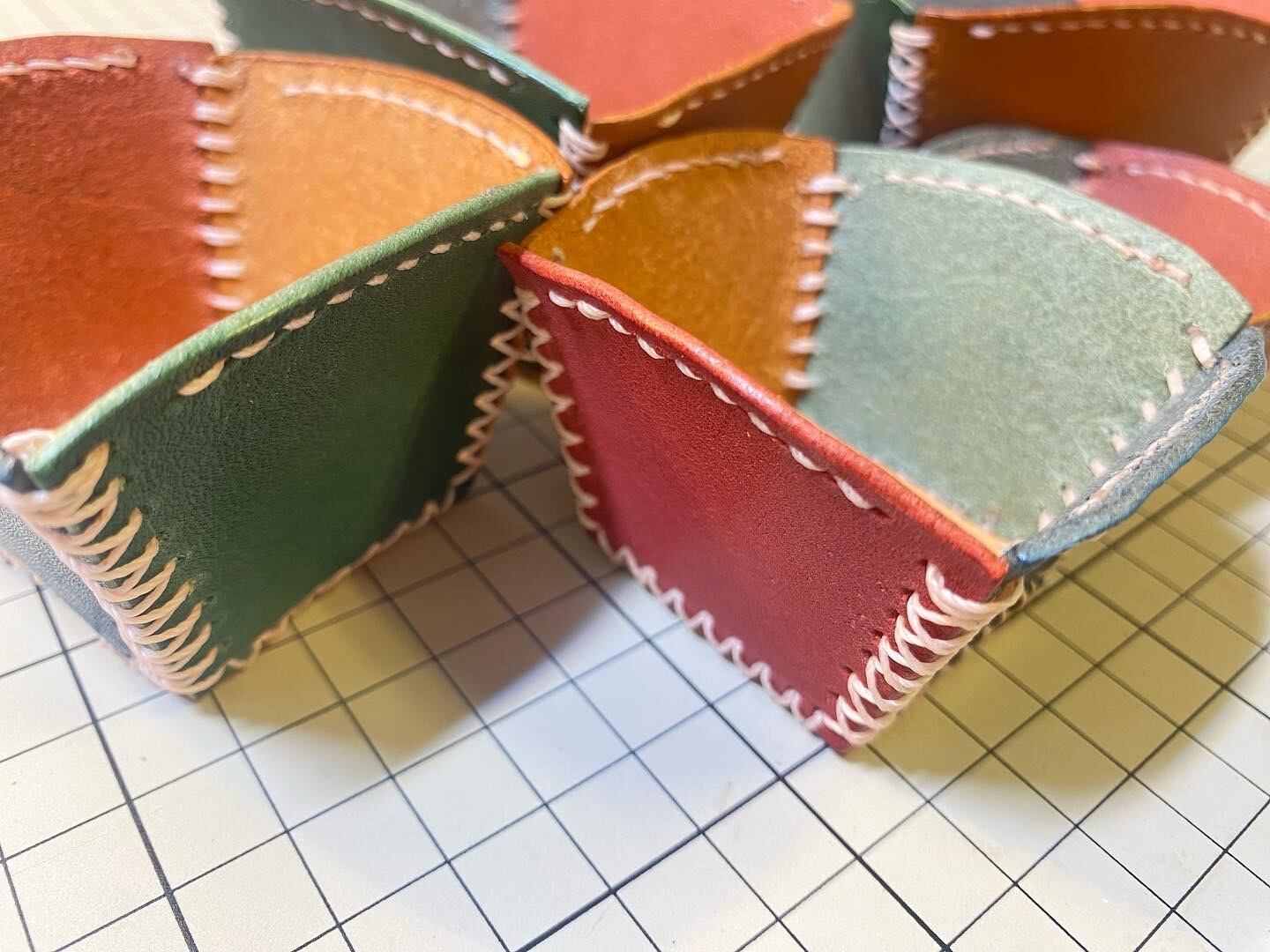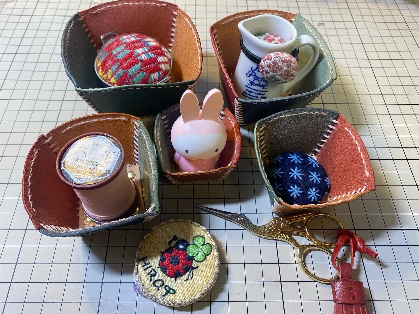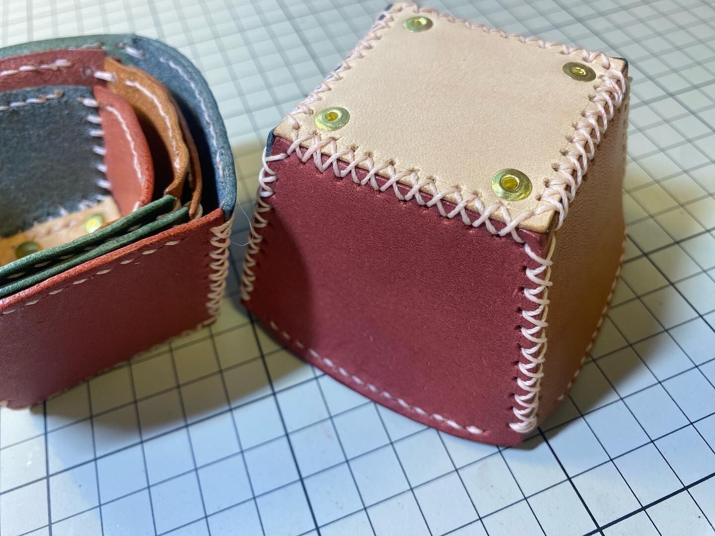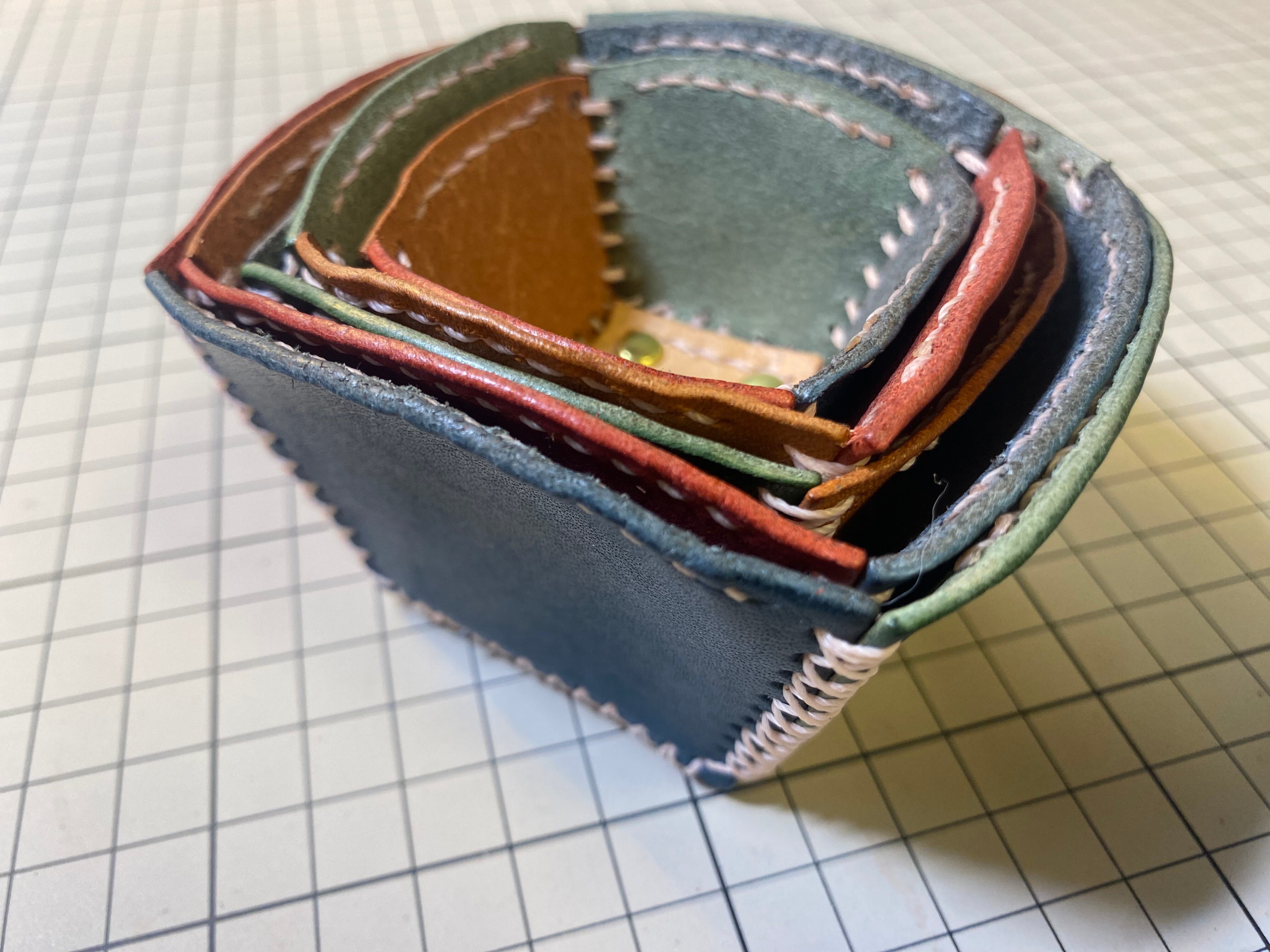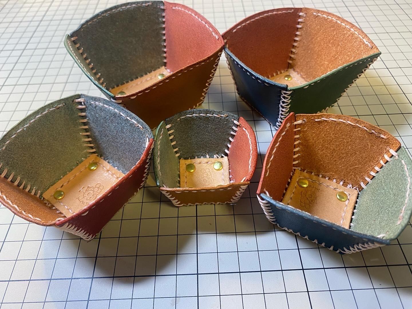 重ねて収納できるマトリョーシカトレーです。栃木レザーのワインレッド、青、赤茶、緑の革をパッチワークで繋いであります。重ねてもよし、並べてもかわいいトレーになっています。