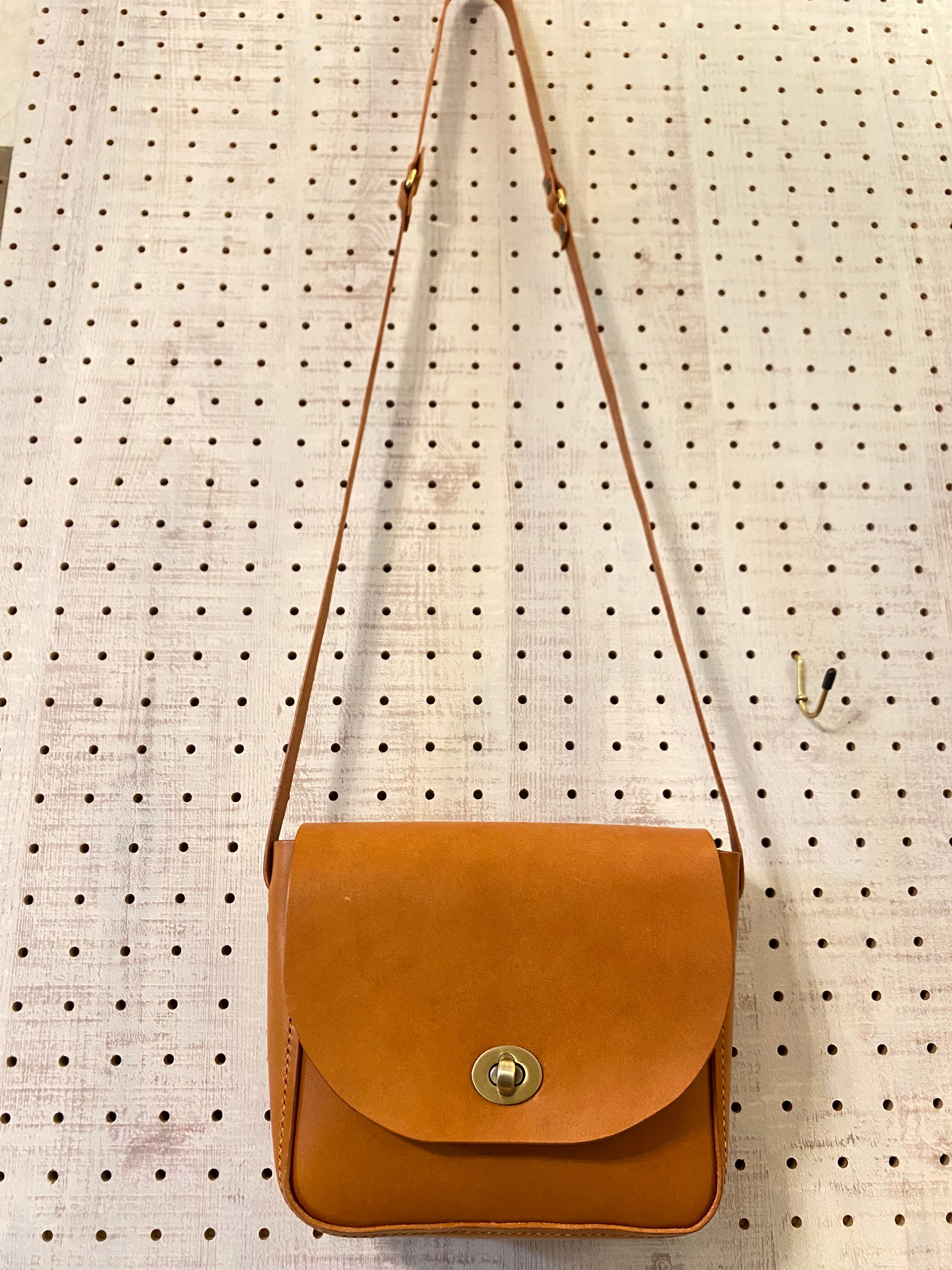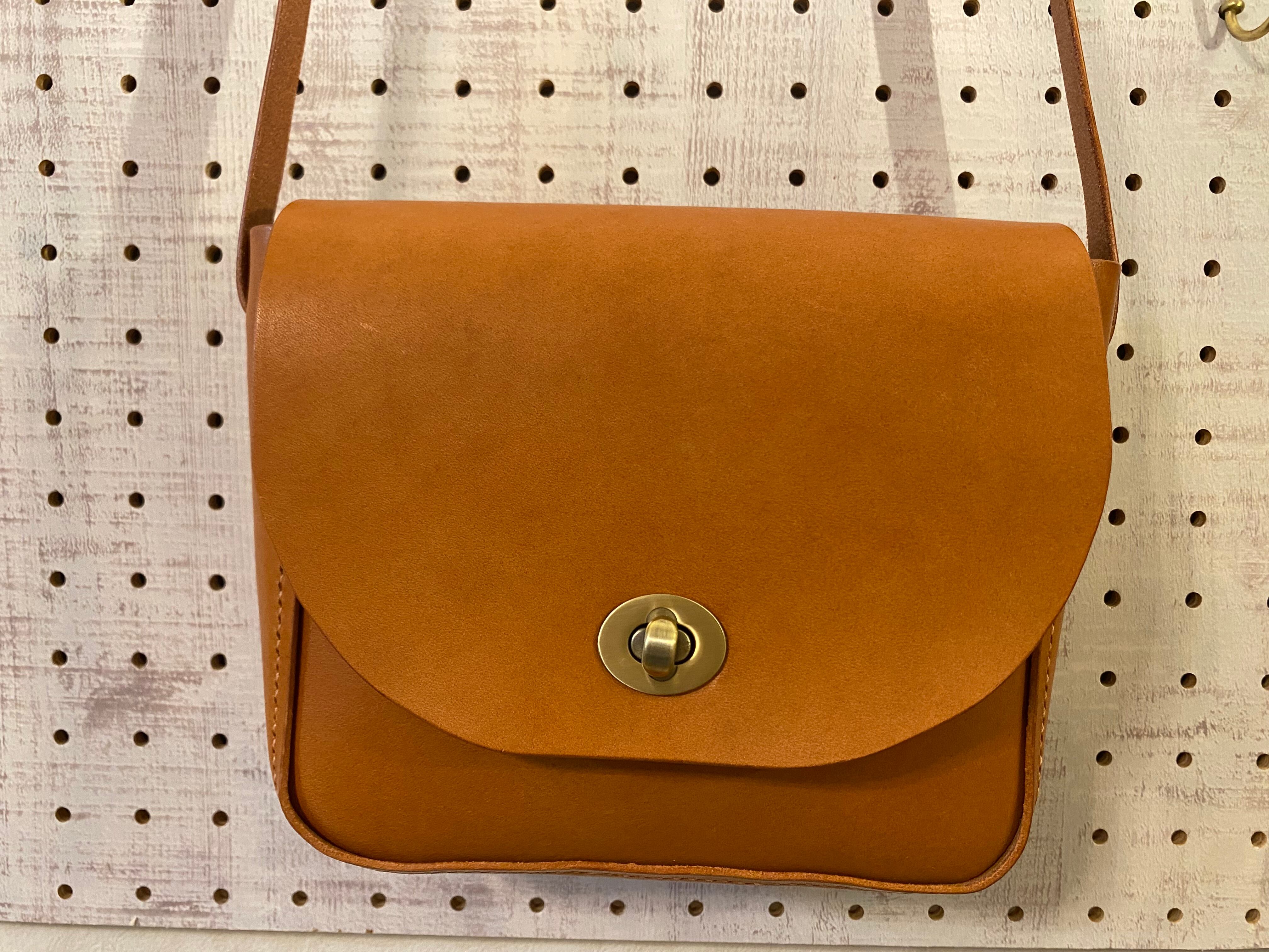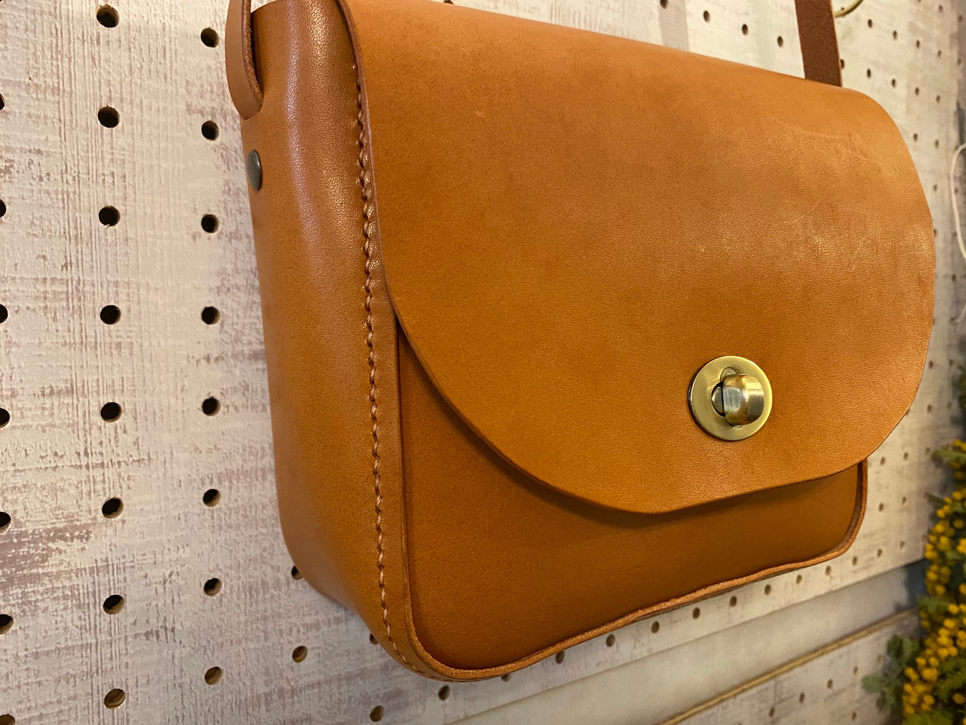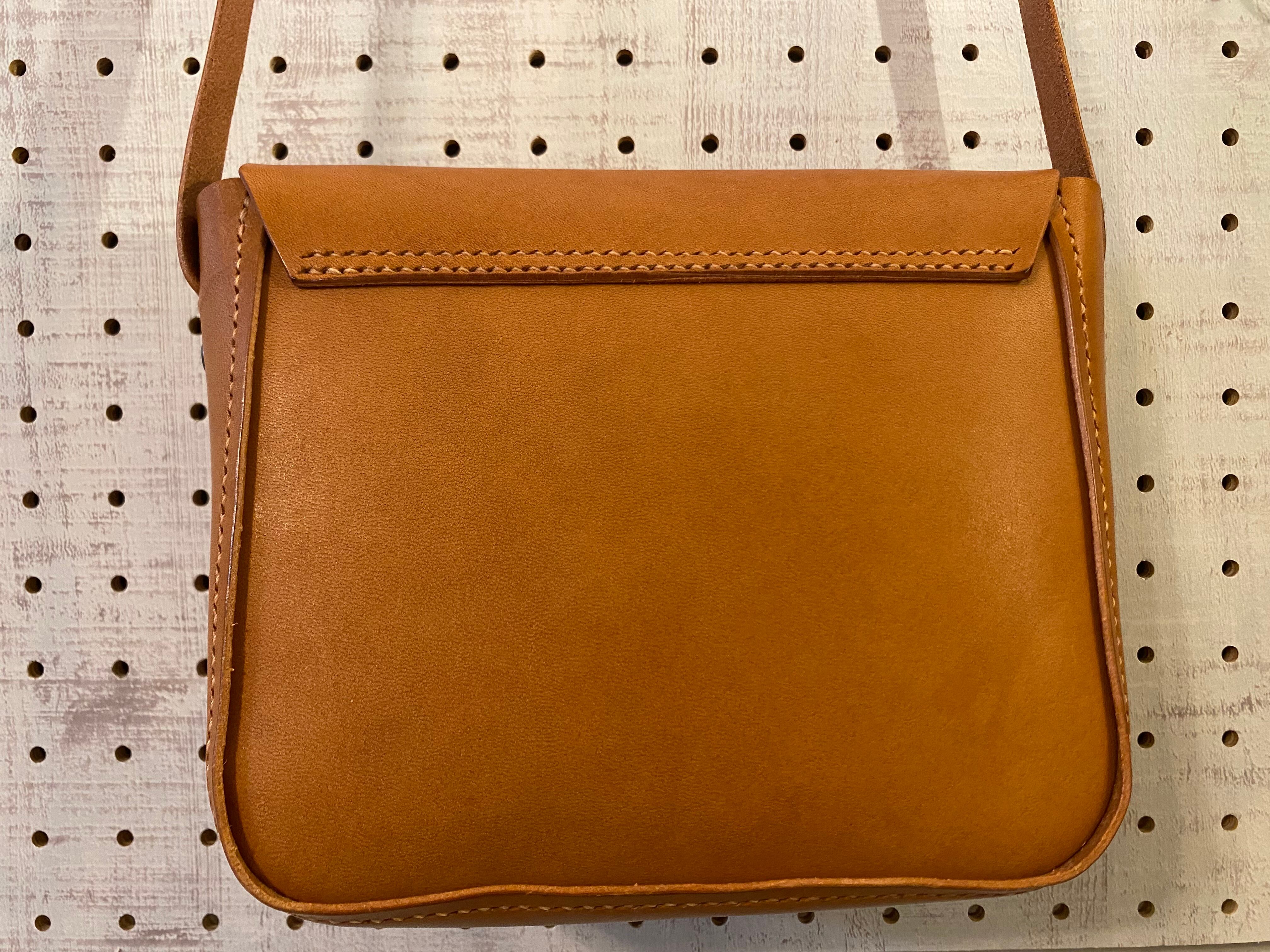 栃木レザーを使用したショルダーバッグです。どんな服にも合わせやすい赤茶色の革を使用しています。18cm×15cmのコンパクトなサイズ感と6cmのマチで、必要な荷物をしっかり収納できます。肩掛けできる長さは約120cmです。